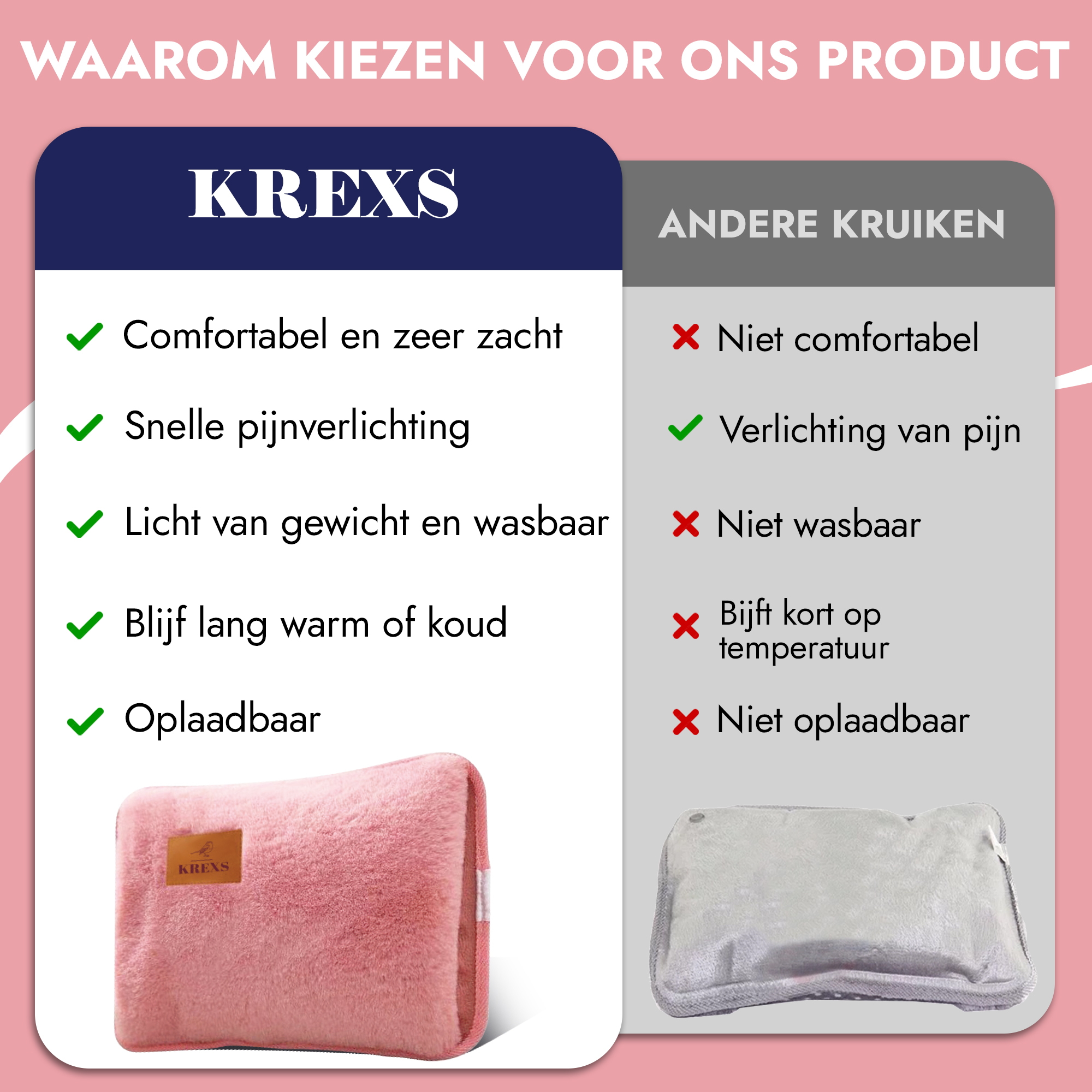 Ben je op zoek naar een veilige en duurzaam geproduceerde elektrische kruik? Dan is de elektrische kruik van Krexs precies wat je nodig hebt! Met slechts 7 minuten opladen geniet je maar liefst 3 uur van warmte. Geen gedoe meer met heet water en geen risico op verbrandingen. Samen optimaal genieten van de warmte, dat wil jij toch ook?